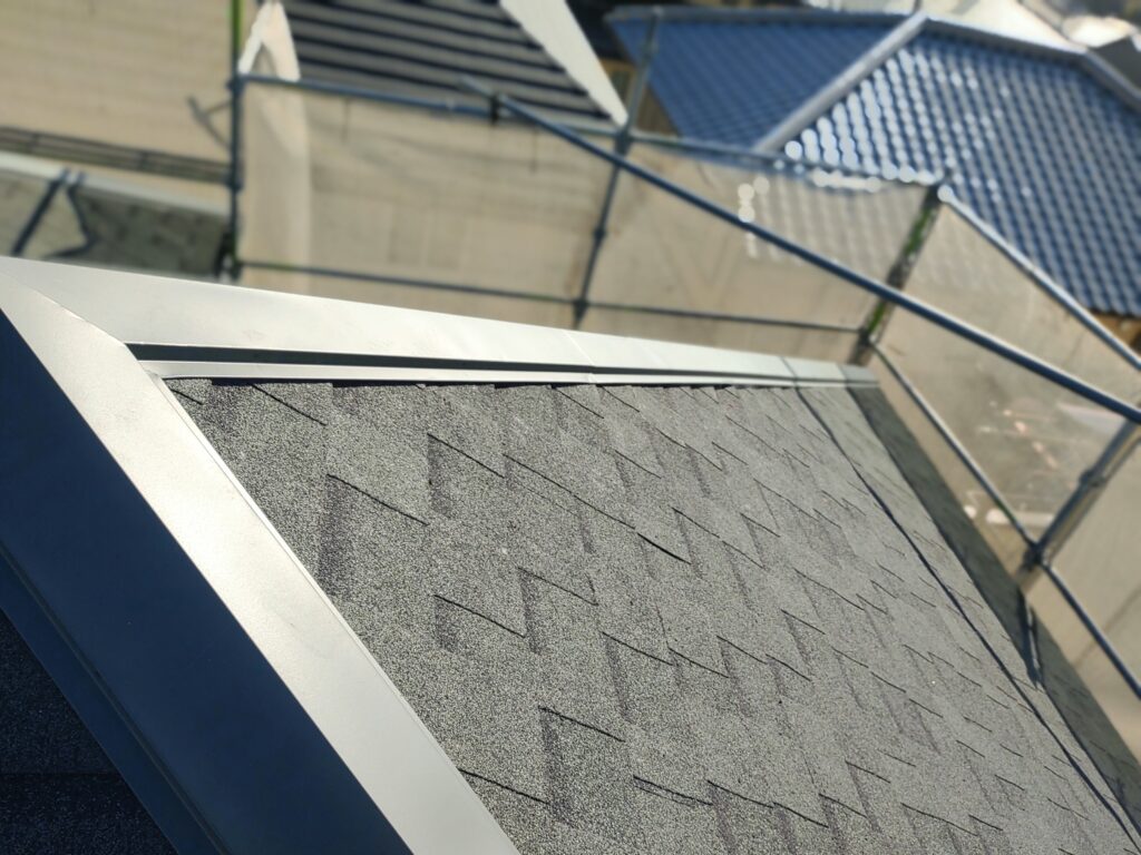 葺き替え前が 瓦のような厚みのある屋根場合、まっすぐ揃うように1枚目の瓦の先端をかさあげしています。広小舞・軒先破風板など、木材でかさ上げされて軒樋が現状の瓦に合わせて取付けられてます。薄い屋根材に葺き替える場合は、流し垂木などで 高さを調整します。これにより